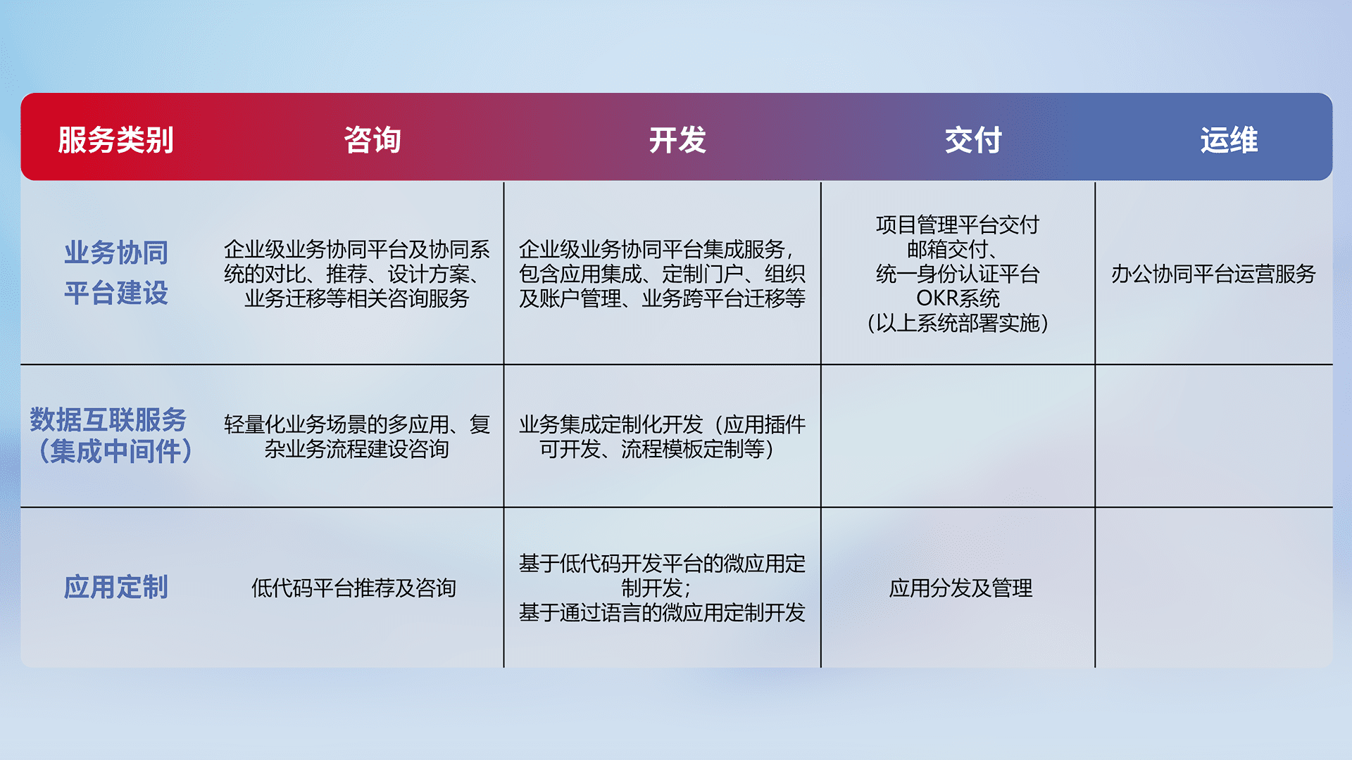 针对钉钉、、企微、、、、IDaas等平台级产品提供产品的规划、、方案、、交付、、、、定制化开发等服务,,,实现如统一协同办公、、、智能客户服务、、混合会议管理、、、、智能数据查询、、、等业务场景,,,,实现数字化转型。。。